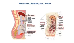 In Male: The peritoneum lining the lower part of the abdominal wall is reflected backwards to cover the superior surface than the upper part of the posterior surfaces of the bladder. Then, it passes backwards above the seminal vesicle to cover the front of the middle third of the rectum to form a rectovesical pouch (7.5 cm above the anal orifice). Then it passes upwards to cover the front and sides of the rectum.