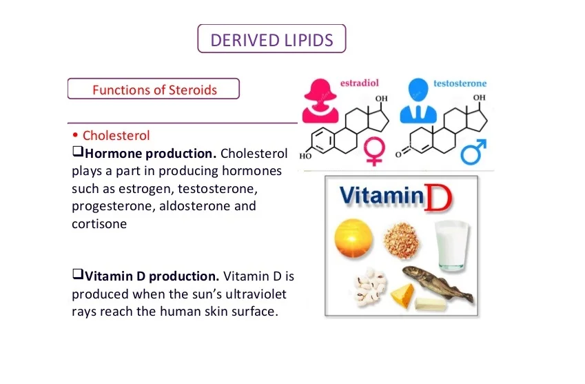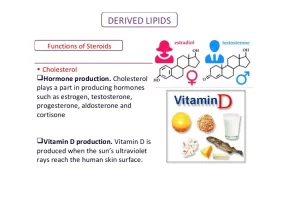 Derived lipids play essential roles in various biological functions and processes in the body. Derived lipids include fatty acids, glycerol, steroids (like cholesterol), fat-soluble vitamins, and other lipid-related molecules.
