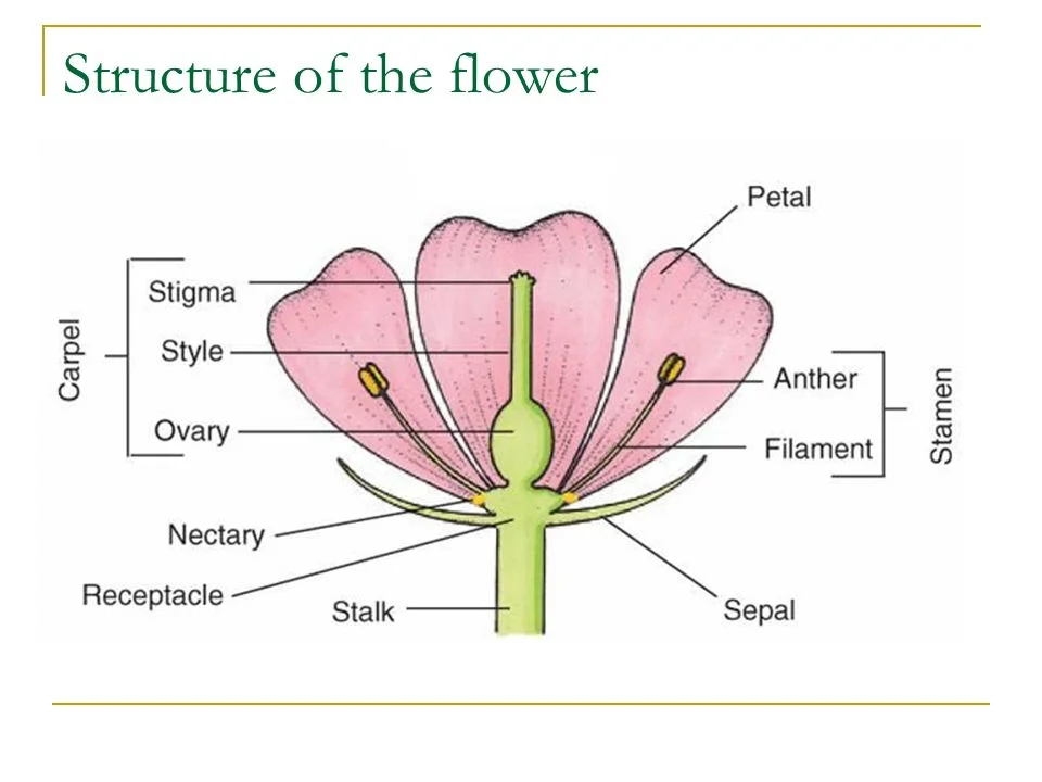 If you examine a flower, you will notice that the flower has a thin neck (pedicle) that ends in a swollen part (receptacle) that carries the floral leaves in four different floral whorls: