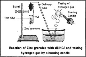 When you put a piece of magnesium strip in a test tube and add some dilute hydrochloric acid (HCl), gas bubbles are evolved. Active metals such as magnesium (Mg) and zinc (Zn) react with dilute acids (as hydrochloric acid) forming a salt of an acid and hydrogen gas which burns with a pop sound on approaching a burning match to it.