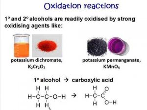 Oxidation in organic chemistry means converting H, which is attached to carbinol, to OH, and it takes place by one of the following reagents “oxidizing agents”, KMnO4 acidified with conc. H2SO4, or K2Cr2O7 acidified with conc. H2SO4 .”Chromic acid”, Where atomic oxygen is produced from the reaction.