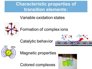 - All transition elements are solid characterized by metallic luster, and good conductor of heat and electricity, They have high melting & boiling points due to the strong metallic bond which is formed due to the sharing of both 4S and 3d electrons in the formation of this bond.