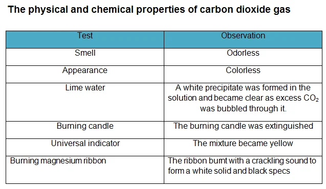 Carbon dioxide gas can change the pH of the water and it dissolves slightly in the water to form a weak acid called carbonic acid, and it is a greenhouse gas as it transmits visible light but it absorbs strongly in the infrared and near-infrared. Carbon dioxide gas does not burn and does not help in burning, so it is used in extinguishing fires, it is heavier than the air, so it is collected by upward displacement of air.