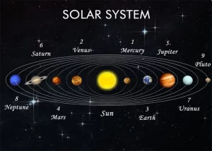 The solar system contains the Sun and eight planets revolving around the Sun, The solar system is located in one of the spiral arms of the Milky Way on the edge of the galaxy, The Sun takes about 220 million years to complete one rotation around the centre of the galaxy, The Earth is one of the planets that rotate around the Sun.