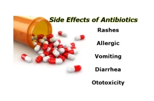 Antibiotics cause some side effects, The side effects are varied and range from fever and nausea to major allergic reactions, The common side effect is diarrhea as antibiotic disrupts the normal balance of the intestinal flora.