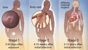 In the tertiary stage, there will be blood vessels, cardiac, nerve system problems, there will be damaged internal organs, And it causes the death, The latent stage, The symptoms disappear for 1-20 years, diagnosis through the blood testing, and relapse the symptoms.