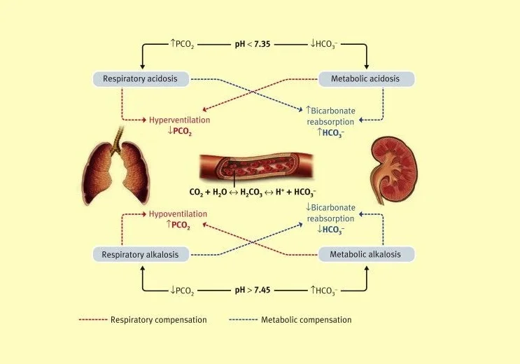 The decreased arterial pH stimulates chemoreceptors in the carotid bodies, which in turn initiate are flex stimulation of alveolar ventilation, The increase in alveolar ventilation results in a decrease in arterial (CO₂)P, Thus, although (HCO3−) P remains low, the (HCO3−)P/PCO₂ and hence arterial pH increases 50%- 70% towards normal, Metabolic acidosis is compensated by the lungs, then the kidneys act to correct the PH back to normal.