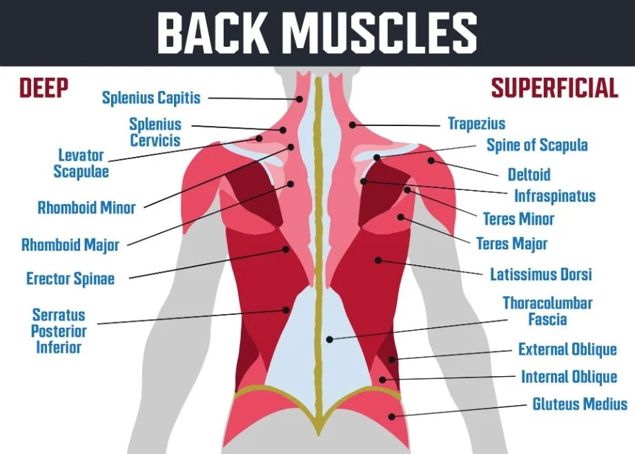 The superficial layer has Trapezius and Latissimus dorsi. The deep layer has a Levator scapula, Rhomboideus minor, and Rhomboideus major. The superficial back muscles originate from the vertebral column and attach to the shoulder bones – the clavicle, scapula, and humerus.