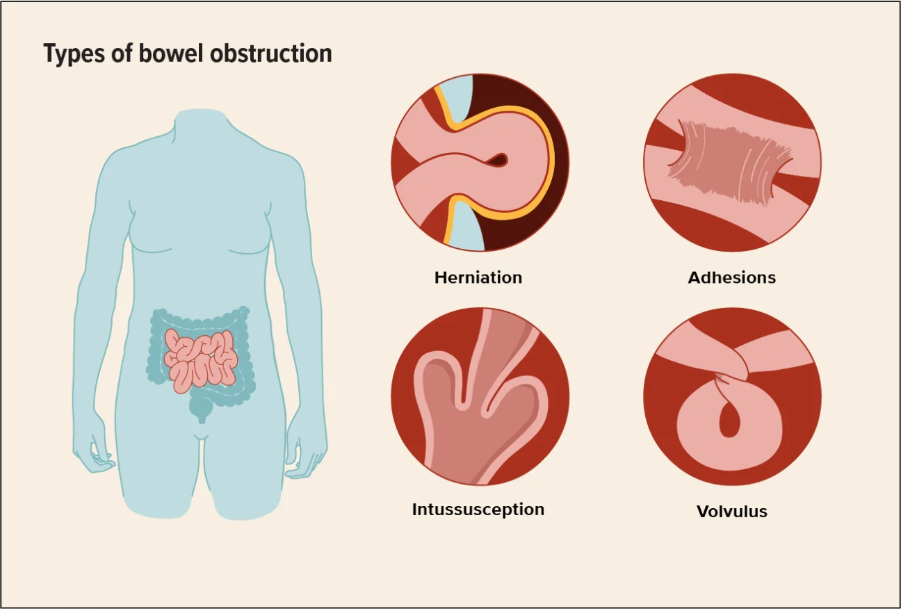 Abdominal obstruction (also called bowel obstruction) occurs when there is a blockage in the intestines that prevents food, fluids, and gas from passing normally through the digestive tract. This can be a partial or complete blockage and may occur in the small or large intestine.