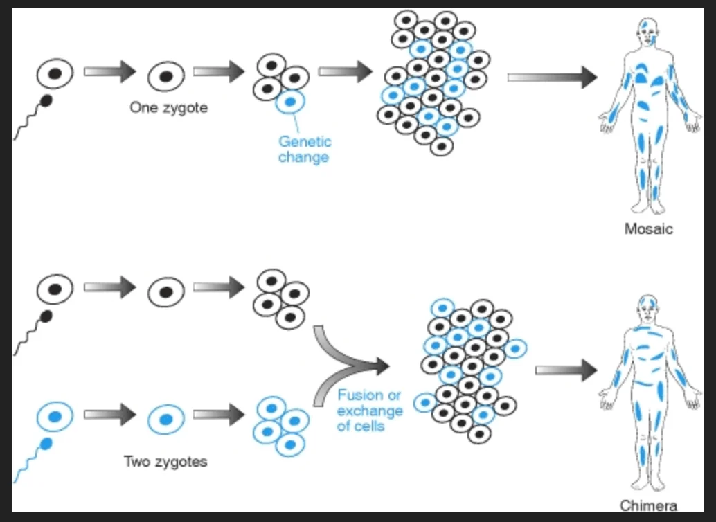 Chimerism is a single organism composed of cells with more than one distinct genotype, the individual derived from two or more zygotes, which can include possessing blood cells of different blood types, subtle variations in form (phenotype) and, when the zygotes were of differing sexes, then the possession of both female and male sex organs, Animal chimeras are produced by the merger of two (or more) embryos.