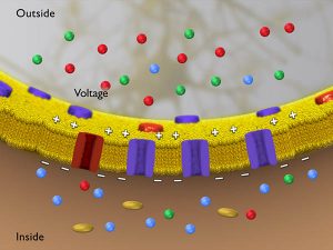 The chief ions on the inner surface are: K+ and proteins with little amounts of Na+, Cl‾, and HCO3‾. The concentration of sodium ions on the outer surface of the membrane is about 15 times greater than that on the inner surface. The concentration of potassium ions on the inner surface is about 30 times greater than that on the outer surface.