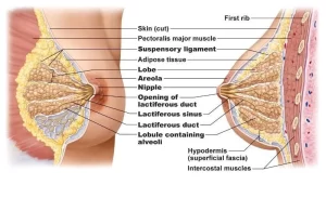 The female mammary gland (breast) is an exocrine gland that is concerned with milk production in lactating females. It is a modified apocrine sweat gland (compound tubulo-alveolar), and the glandular tissues are located in the fatty layer of the superficial fascia of the pectoral region. In male, the glandular tissue is rudimentary with scanty fat around it.