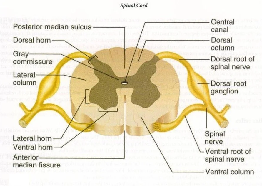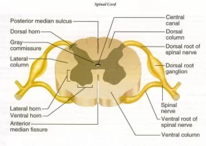 - The ventral (anterior) white column: between the anterior median fissure and the anterior horn at the exit of the ventral root of the spinal nerve.