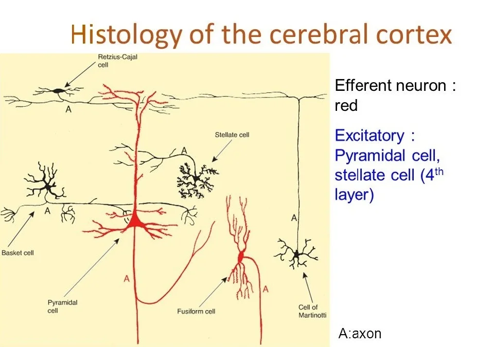- Pyramidal cells: They have a pyramidal cell body with the apex directed to the cortical surface, a thick apical dendrite passes towards the surface where it ends into fine branches, The axon arises from the middle of the base of the cell and passes into the underlying white matter.