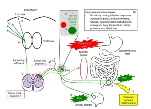 - Visceral inflammatory processes and ulcerations as gastric ulcers result in chemical irritation and pain.