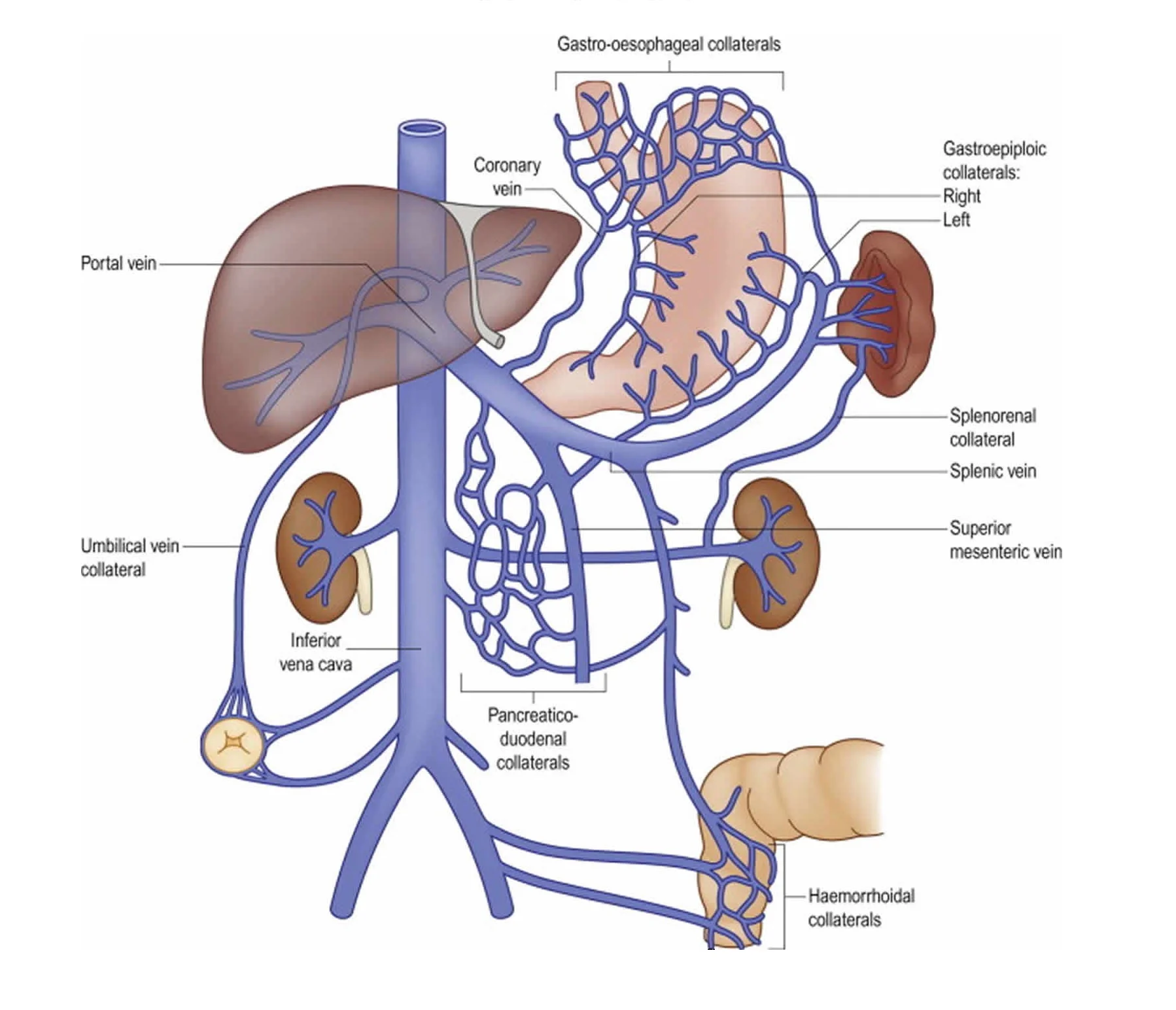 - At the end lower of the anal canal, Portal vein: Superior rectal vein, Systemic vein: Middle, inferior rectal veins, Effect: Rectal varices Piles (haemorrhoids) —-> bleeding per rectum.