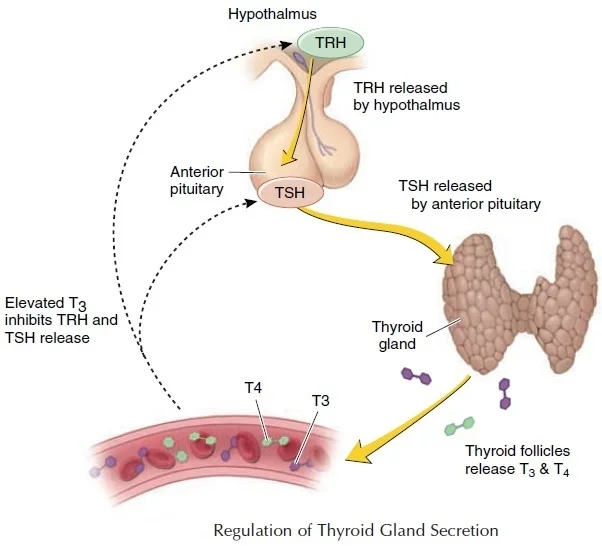 Feedback regulation of thyroid secretion: Increased thyroid hormones decrease the secretion of TSH by the anterior pituitary mainly by a direct negative feedback effect on the anterior pituitary and secondarily by weaker effects on the hypothalamus, This mechanism maintains a constant hormonal blood level.