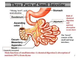 The small intestine, is a part of the gut, extending from the pyloric end of the stomach to the beginning of the large intestine at the ilio coecol junction. Its length is about 6 meters.