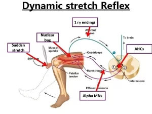 Based on the dynamic response of the primary endings to stretch: This reflex occurs while the muscle length is actually increasing, and is produced mainly as a result of the stretch of the nuclear bag fibers (rapidly adapting receptors). The response is a rapid increase in the rate of discharge from the primary endings as they are very sensitive to the velocity of the change in muscle length during a stretch followed by a marked decrease when the new length is maintained. It provides information about the speed of movements to allow for quick corrective movements.