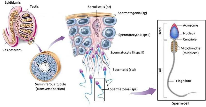 Spermatogenesis (formation of spermatozoa) is a process by which the male germ cells are transformed into spermatozoa. Spermatogenesis occurs in the seminiferous tubules during active sexual life, under the stimulatory effects of the anterior pituitary gonadotropic hormones. It begins at an average age of 13 years and continues throughout the remainder of life but decreases markedly in old age.
