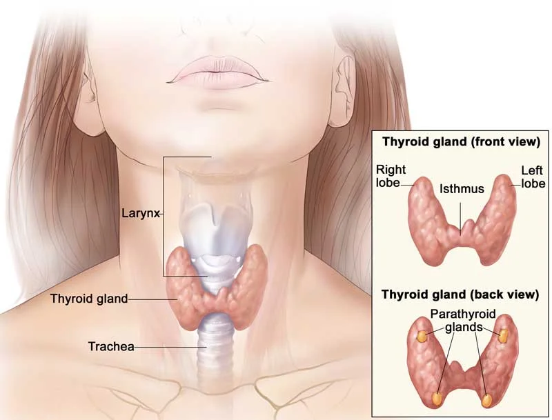 The thyroid is an endocrine gland, it is in the neck and it consists of two connected lobes, The lower two-thirds of the lobes are connected by a thin band of tissue called the thyroid isthmus. The thyroid gland makes two hormones and they are secreted into the blood: thyroxine (T4) and triiodothyronine (T3), These hormones are necessary for all the cells in your body to work normally.