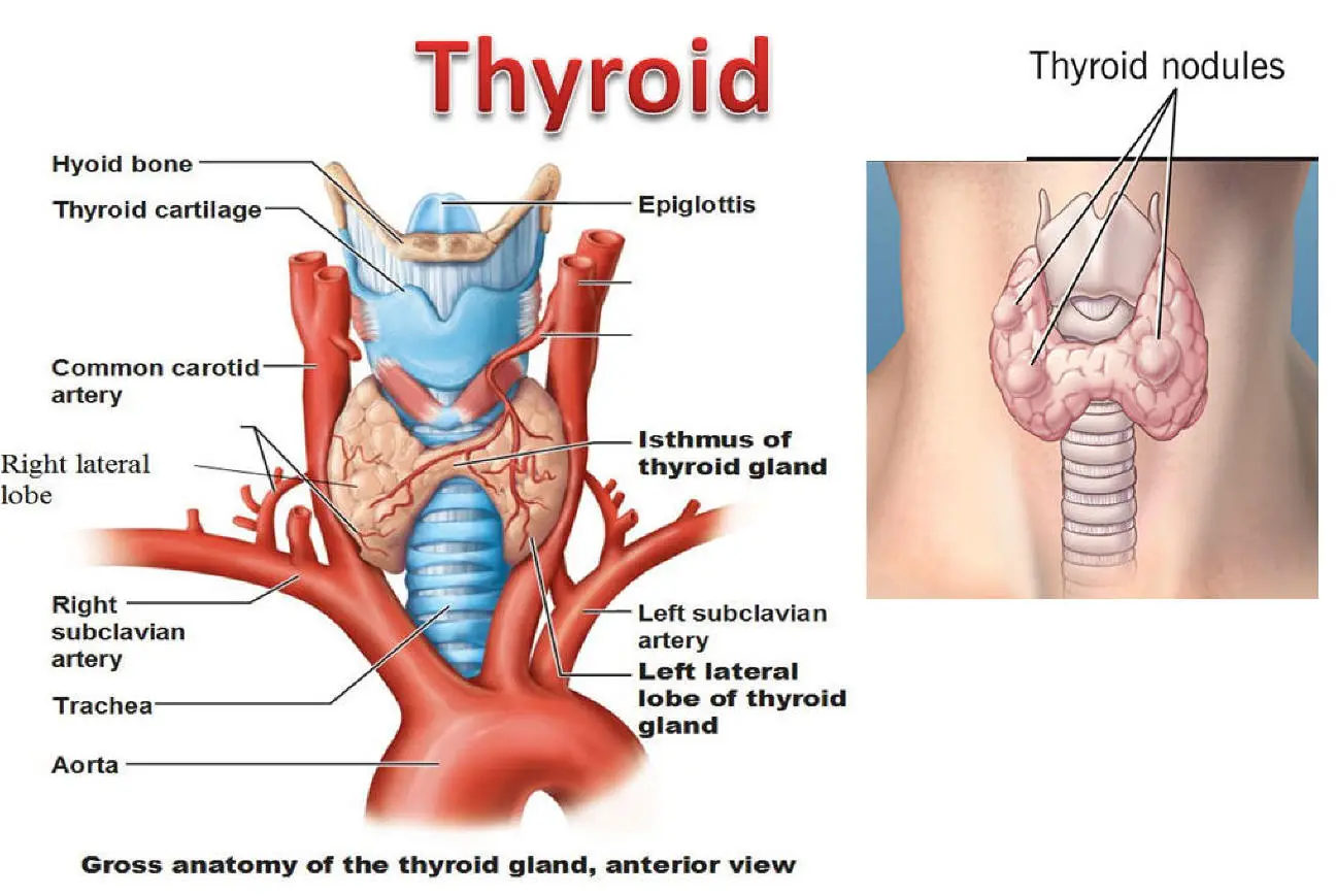 The thyroid gland is a small, butterfly-shaped endocrine gland located at the front of the neck, just below the Adam’s apple. It produces thyroid hormones that regulate the body’s metabolism.