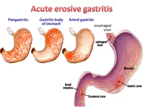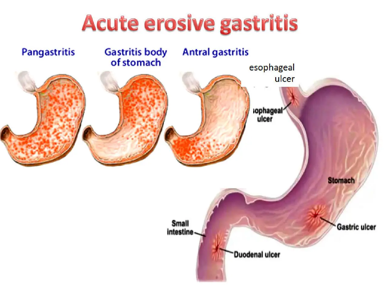 - Ulcer formation – Erosions may develop into peptic ulcers.