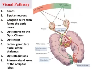 The fibers of each optic tract then synapse in the dorsal lateral geniculate body of the thalamus (LGN), and from there, geniculocalcarine fibers pass by the way of optic radiations (also called geniculocalcarine tract) to the primary visual cortex located mainly in the calcarine fissure area of the medial occipital lobe (Brodmann’s area 17), The areas surrounding it (areas 18 and 19 are the visual association areas.