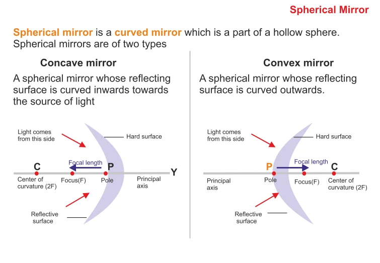The concave mirror is a mirror, whose reflecting (shining) surface is a part of the inner surface of the sphere, The concave mirror is called a converging mirror as it converges (collects) the parallel light rays that fall on its surface.