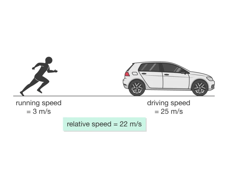 - When the observer is moving in the same direction at a different speed. The relative speed = The real speed of the object − The observer’s speed. So, The real speed of the object = The relative speed of the object + The observer’s speed. The relative speed of the car = 100 − 60= 40 km/h. , so, The relative speed is less than the real speed.