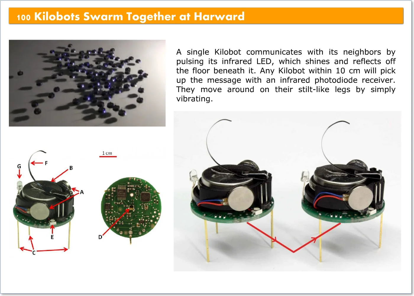 - Low Cost: Kilobot enables experiments with hundreds or thousands of robots.