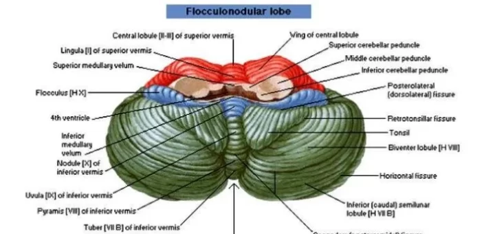 The cerebellum consists of two large hemispheres which are united by a midline vermis. It presents an anterior notch occupied by the brainstem and a posterior notch occupied by flax cerebelli, It is the...