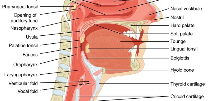 The pharynx is a musculo-membranous tube that extends behind the nasal cavities, the mouth, and the larynx. The mucous membrane of the pharynx differs in its lining epithelium from one part to the other.