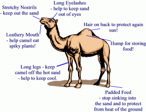 Camel limbs end in a thick flat pad to enable the camel to wander through the hot desert sand, Horse limbs end in a strong solid hoof to help the horse go through the rocky soil, The structure of a camel pad and a horse hoof suit the way of movement and the environmental conditions in which they live, and this is known as adaptation.