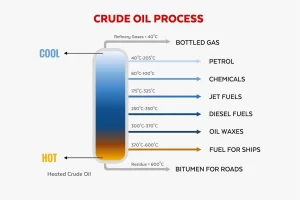 The separation of petroleum oil is also known as crude oil refining, It is a process that involves breaking down crude oil into its useful components. This process is primarily carried out through fractional distillation and other refining techniques to produce fuels and other products.
