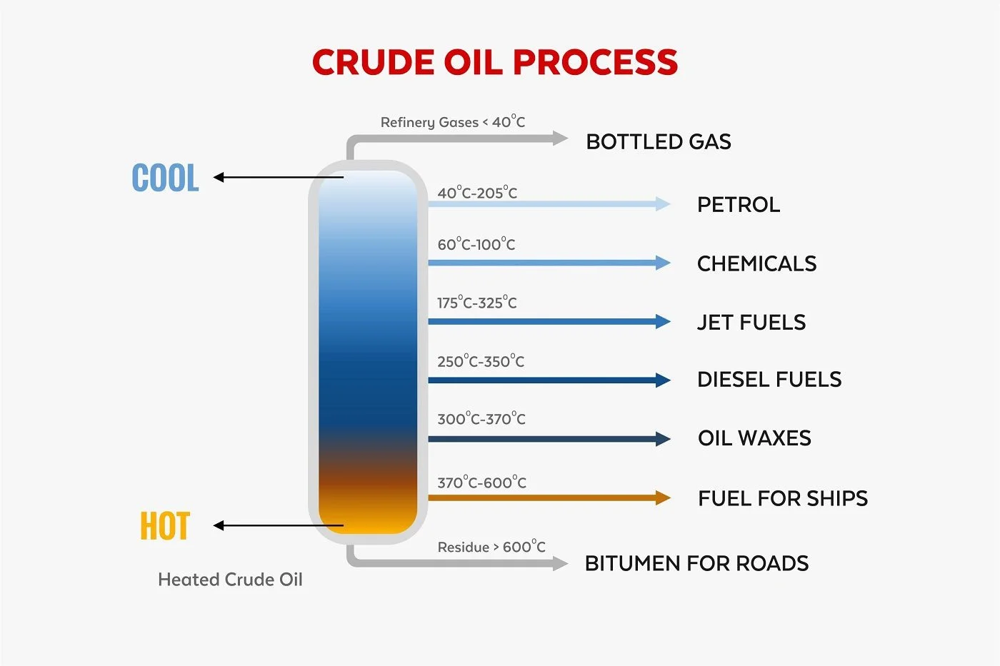 - Petroleum gases (propane, butane) – top of the column, around 20-100°C.